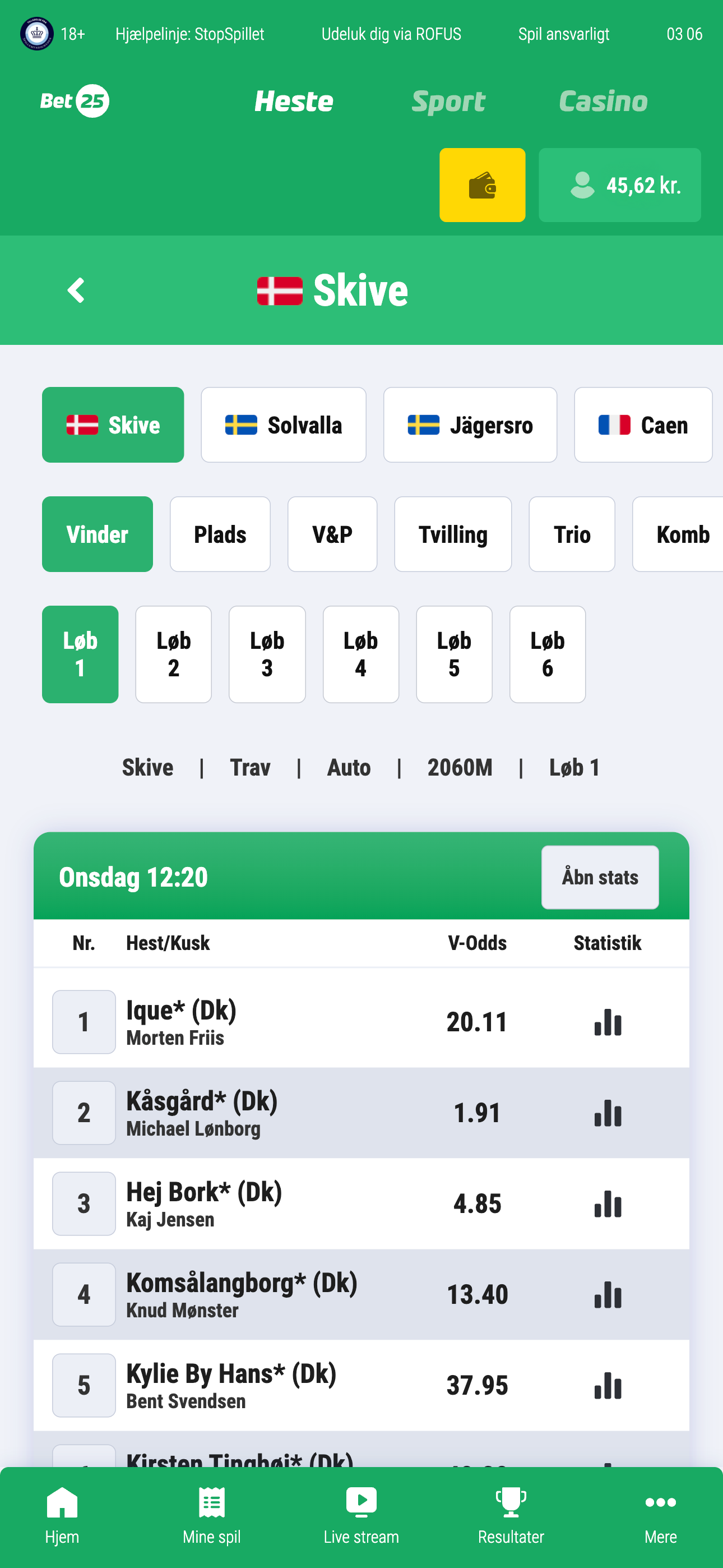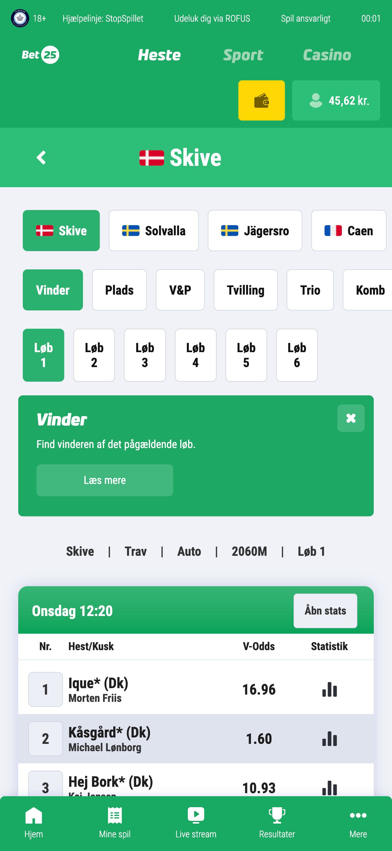 Gå til Bet25.dk eller åben appen og opret dig eller log ind, hvis du allerede har en konto. Vælg dato og bane øverst. Vær opmærksom på, at valget nulstilles, hvis du forlader siden.